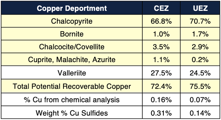 Los sulfuros de cobre representaron ~71% a 75% del cobre total dentro de los compuestos CEZ y ZUE. La calcopirita es el sulfuro de cobre dominante y representa ~67% a 71% del cobre en las muestras compuestas. Bornita, calcocita, cuprita, malaquita y azurita también estaban presentes en las muestras compuestas. El resto del cobre (~24% a 28%) estaba presente en la valleriita (sulfato de Cu-Fe-Mg). Los contenidos de sulfuro de cobre fueron del 0,31 % en peso en la ZEC y del 0,14 % en peso en la ZUE. Estos resultados se resumen en la Tabla 3 a continuación.